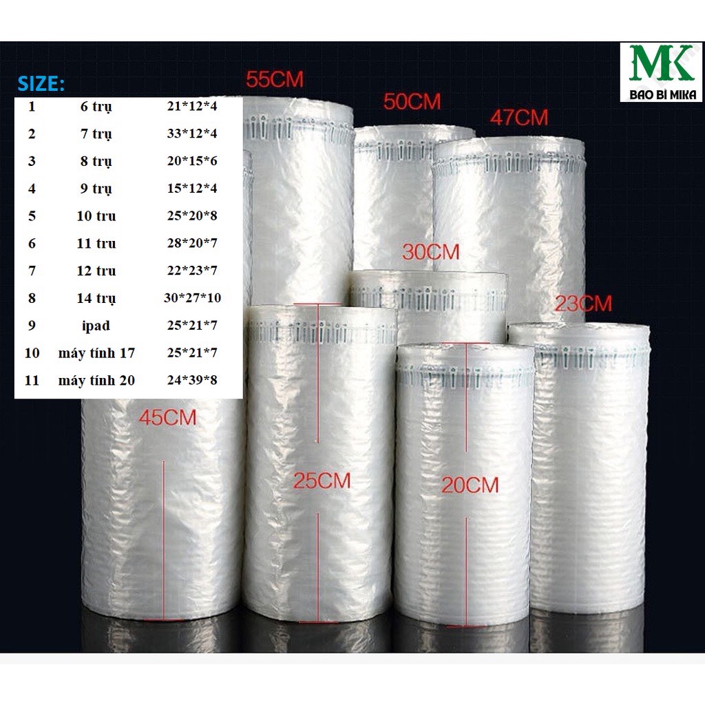 - Kich thước: cao 20cm/30cm/40cm,…Sau khi bơm căng ống khí có thể co lại từ 2-5cm.